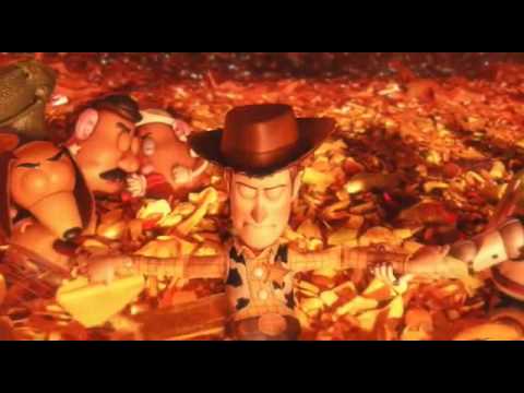 Als die Spielzeuge keinen Ausweg mehr sehen, nehmen sie sich an die Hände und lassen ihr Schicksal über sich ergehen.